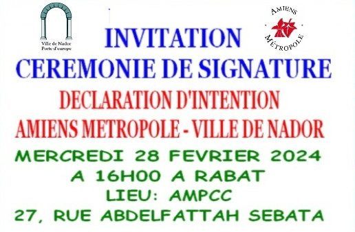 Déclaration d'intention Amiens Métropole - Ville de Nador Participants : Alain Gest - Président d'Amiens Métropole Slimane Azouarghe - Maire de la Ville de Nador Salaheddine El Manouzi - Président de l'AFM Les 2 Rives Zakaria El Bouryahi - Président de CECODEL